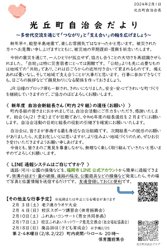 令和5年7月より光丘町自治会で独自にブログを立ち上げました。 町内の皆さまを中心に事業活動やお役立ち情報などをタイムリーに発信していきますのでよろしくお願いします。